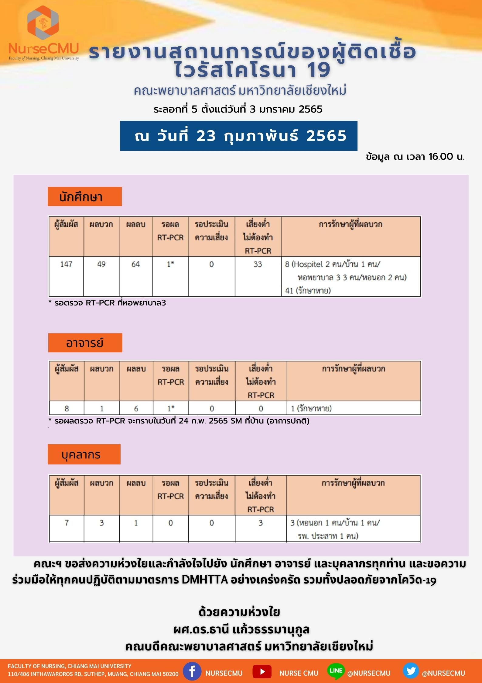 สถานการณ์ผู้ป่วย COVID-19 ในความดูแลของคณะพยาบาลศาสตร์ ประจำวันที่ 23 กุมภาพันธ์ 2565